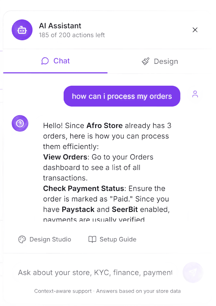 Ask anything and receive step-by-step, personalized help based on your store data inside JoatCart.