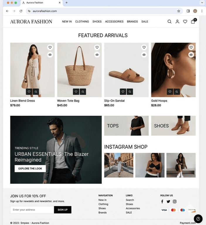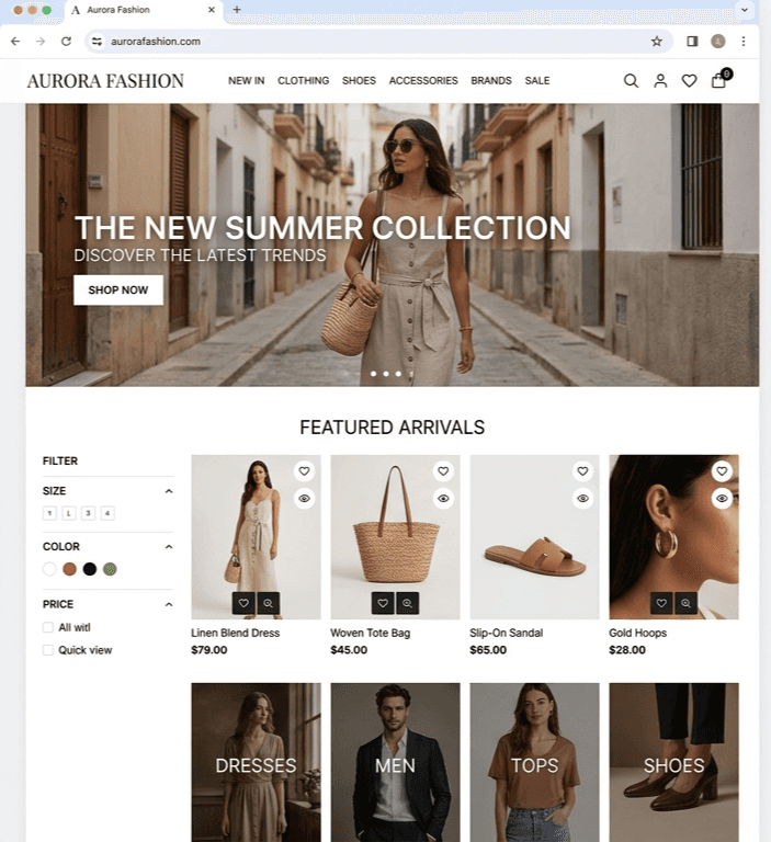 “Create a modern fashion store theme with a clean layout and large product images.”